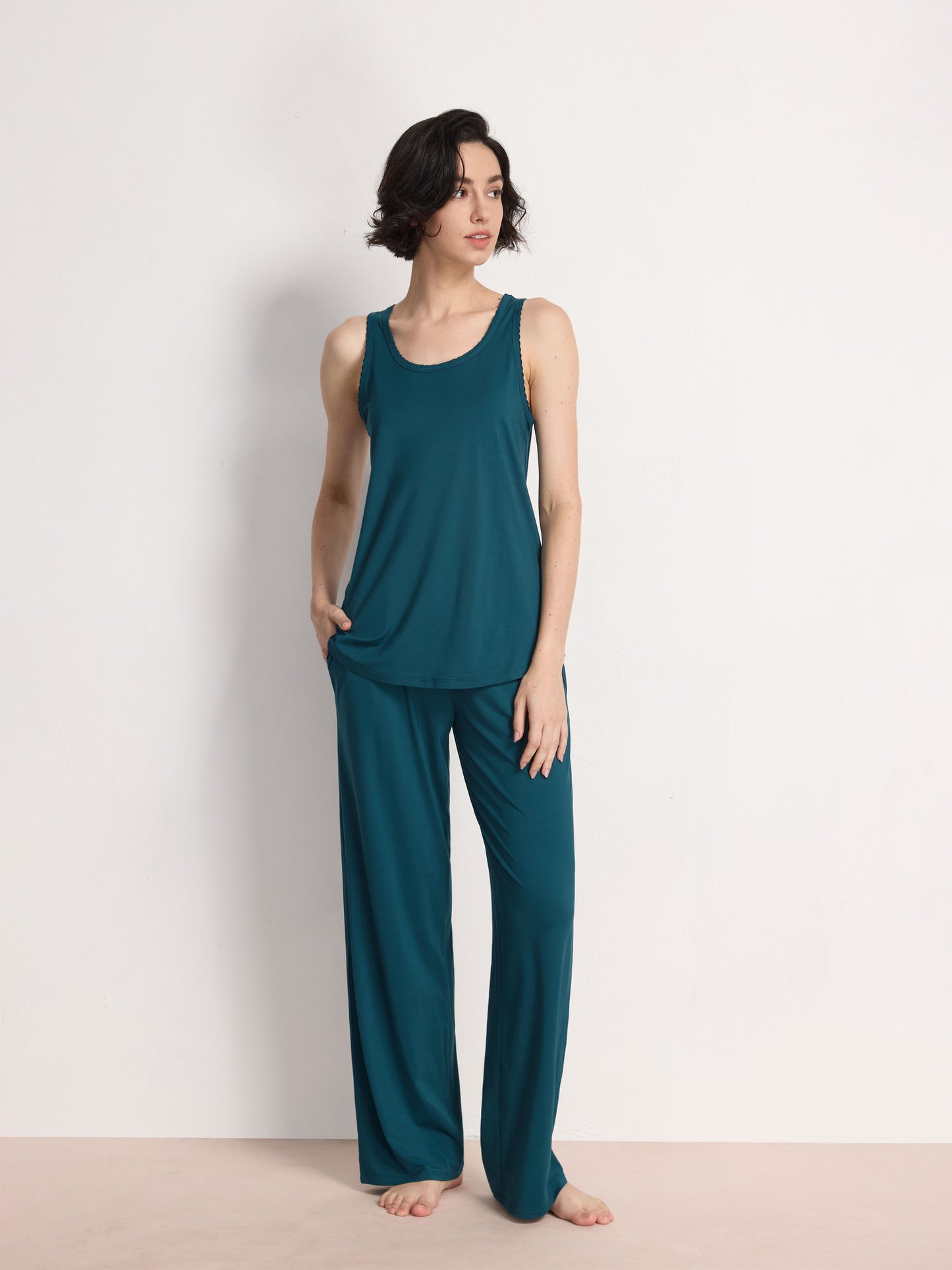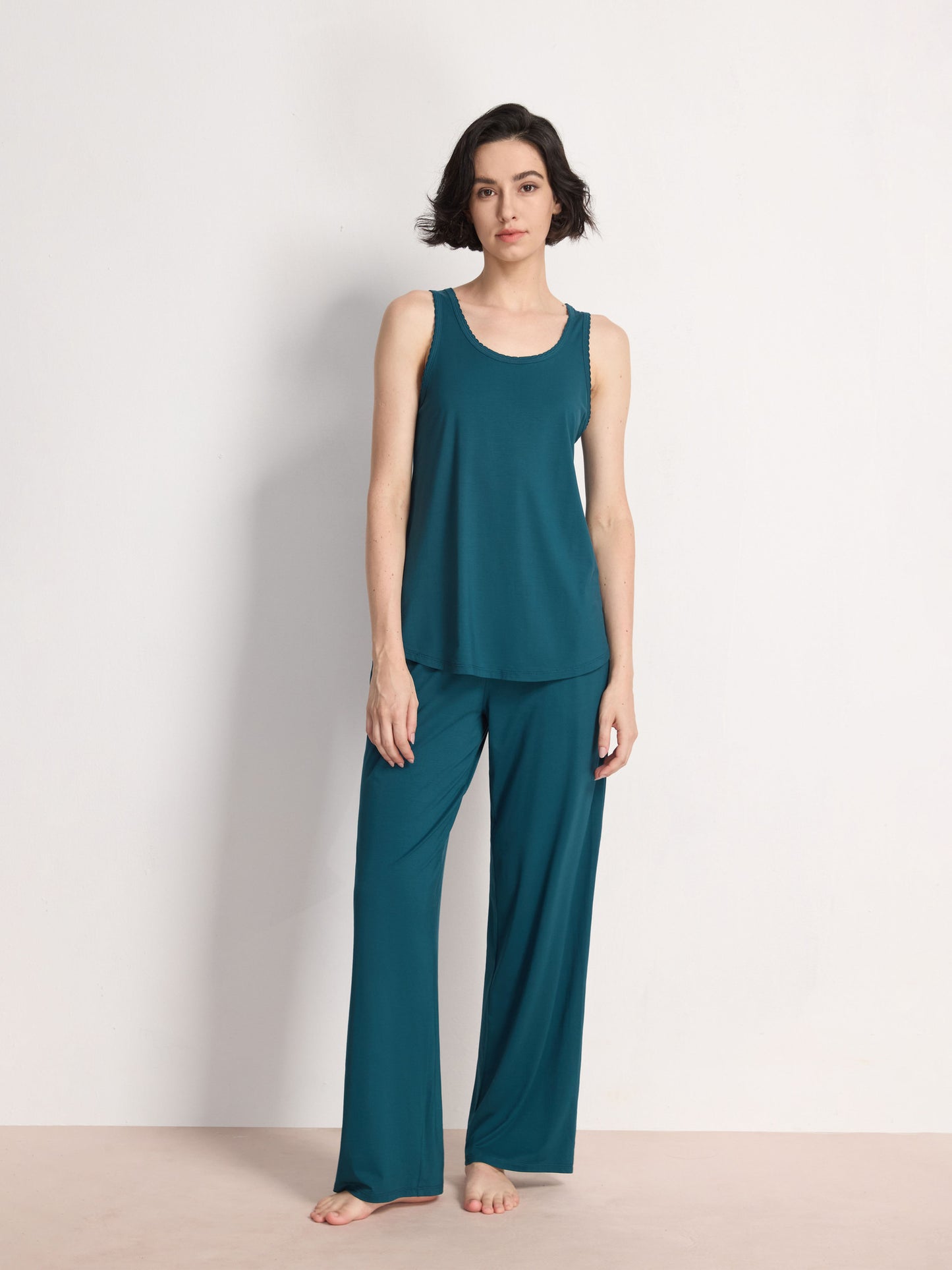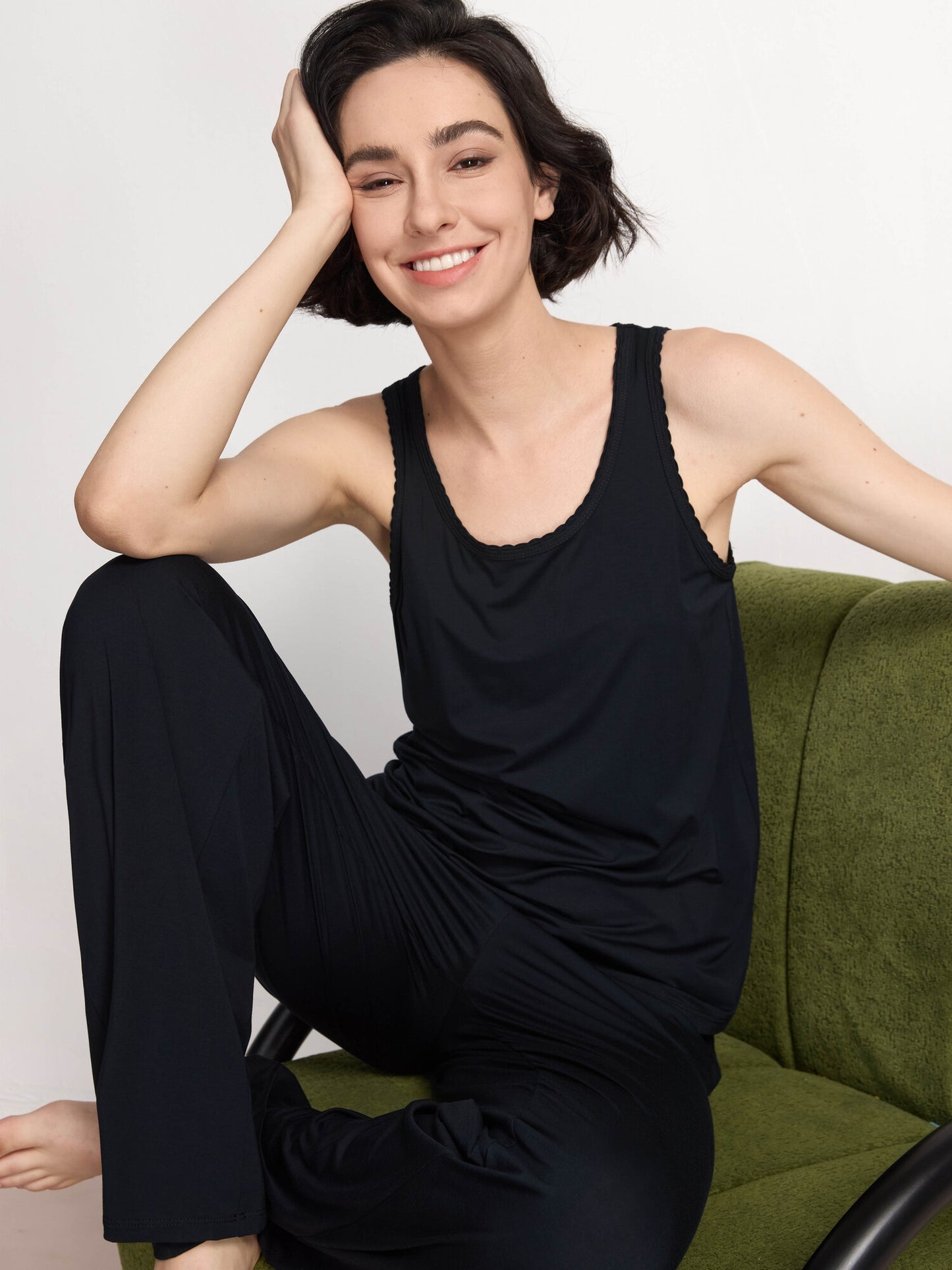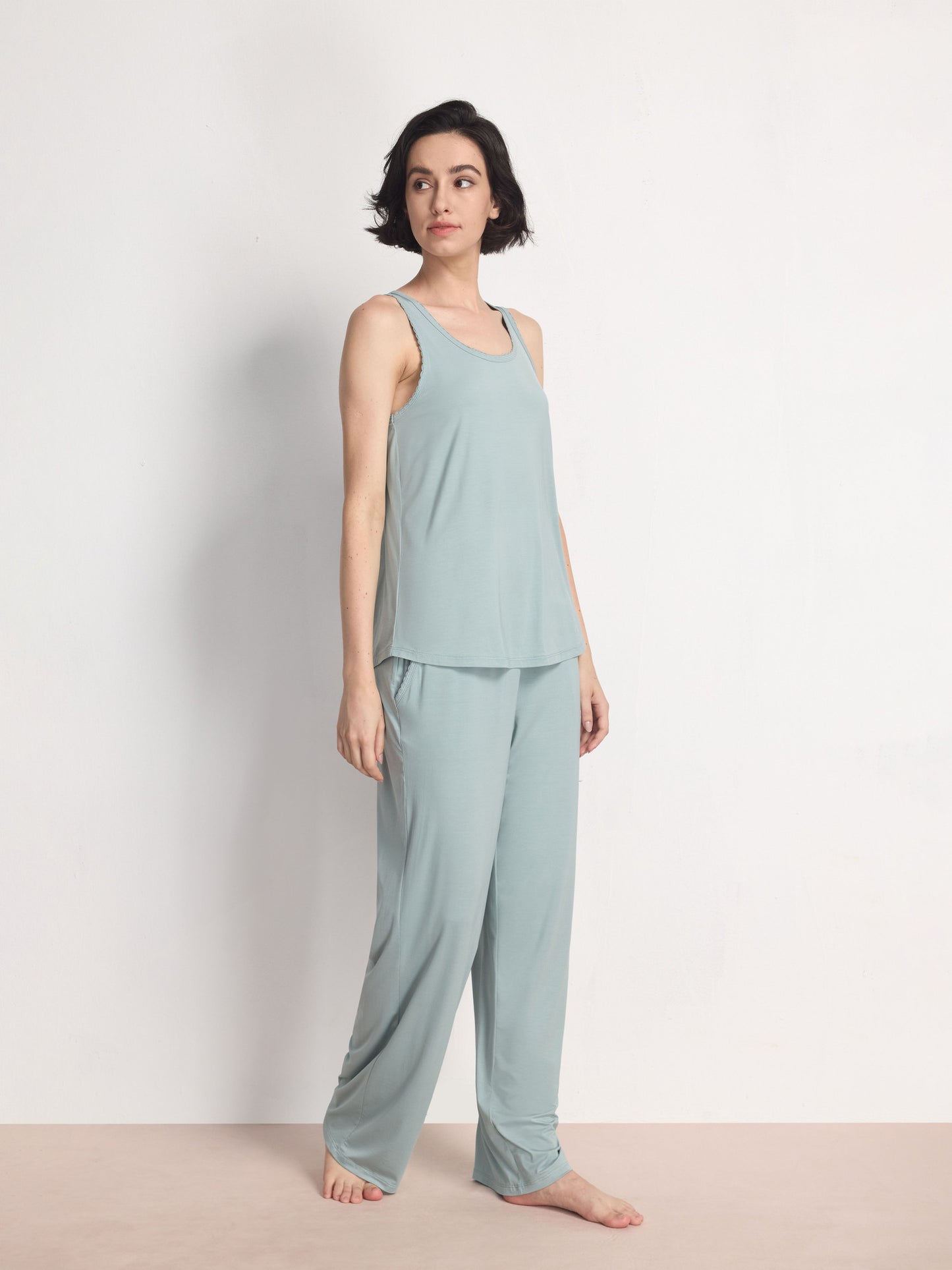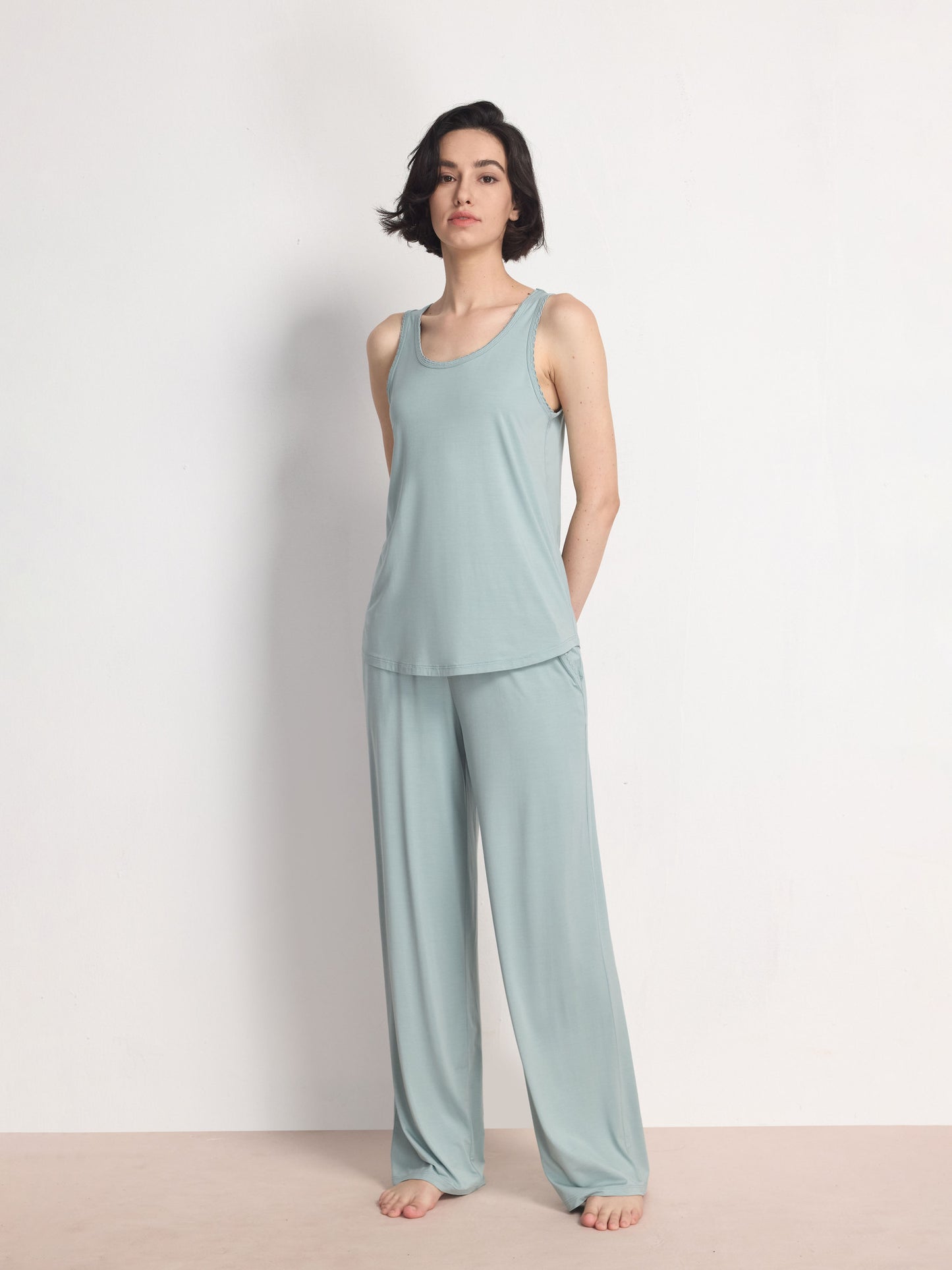 A cooling bamboo tank pajama set designed for zero-restriction comfort—soft on skin, moisture-friendly, and effortless to wear. The sleeveless tank and wide-leg pants drape smoothly without cling, while refined trim details add quiet sophistication to a minimalist look.