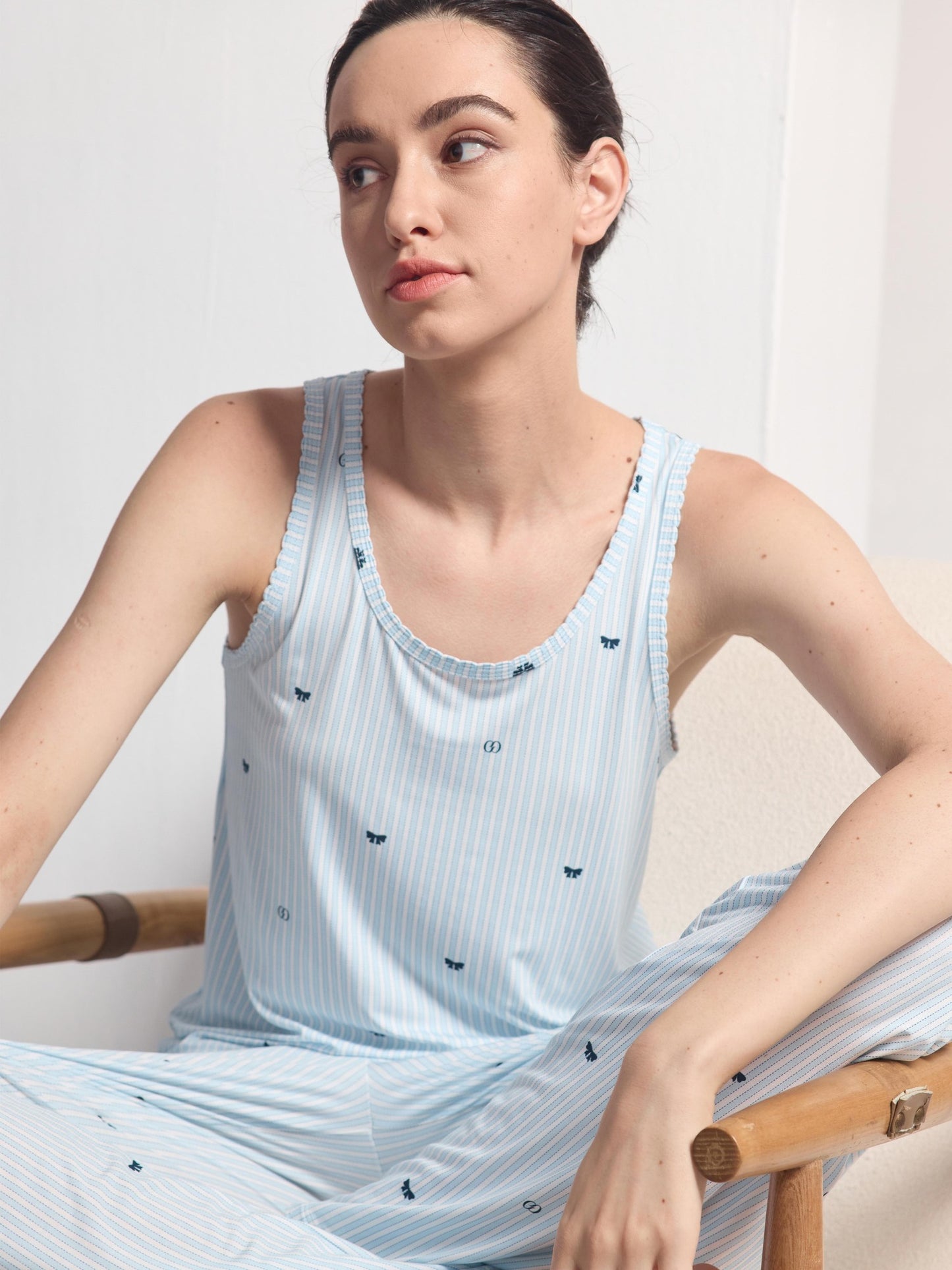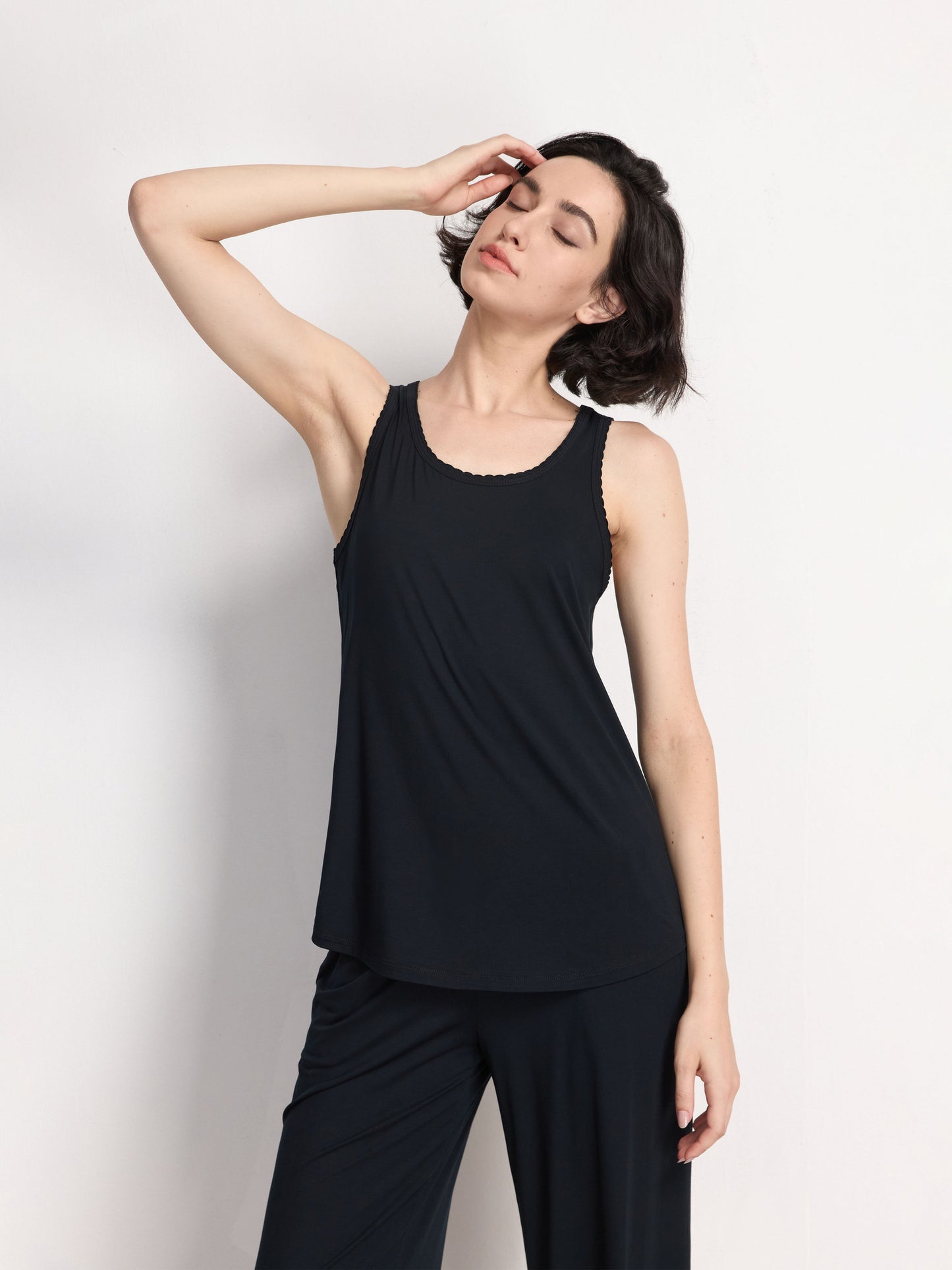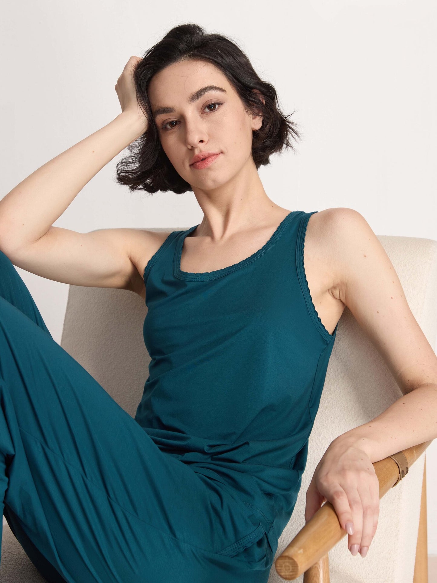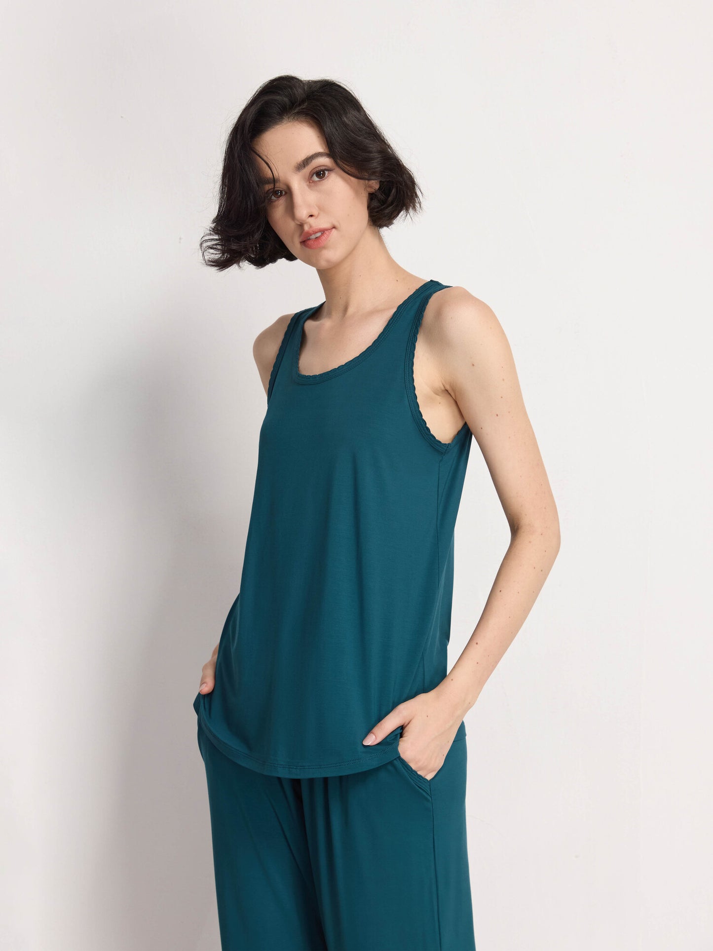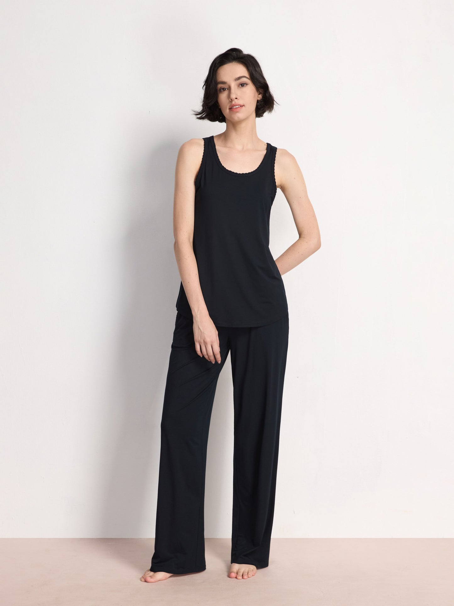 A cooling bamboo tank pajama set designed for zero-restriction comfort—soft on skin, moisture-friendly, and effortless to wear. The sleeveless tank and wide-leg pants drape smoothly without cling, while refined trim details add quiet sophistication to a minimalist look.