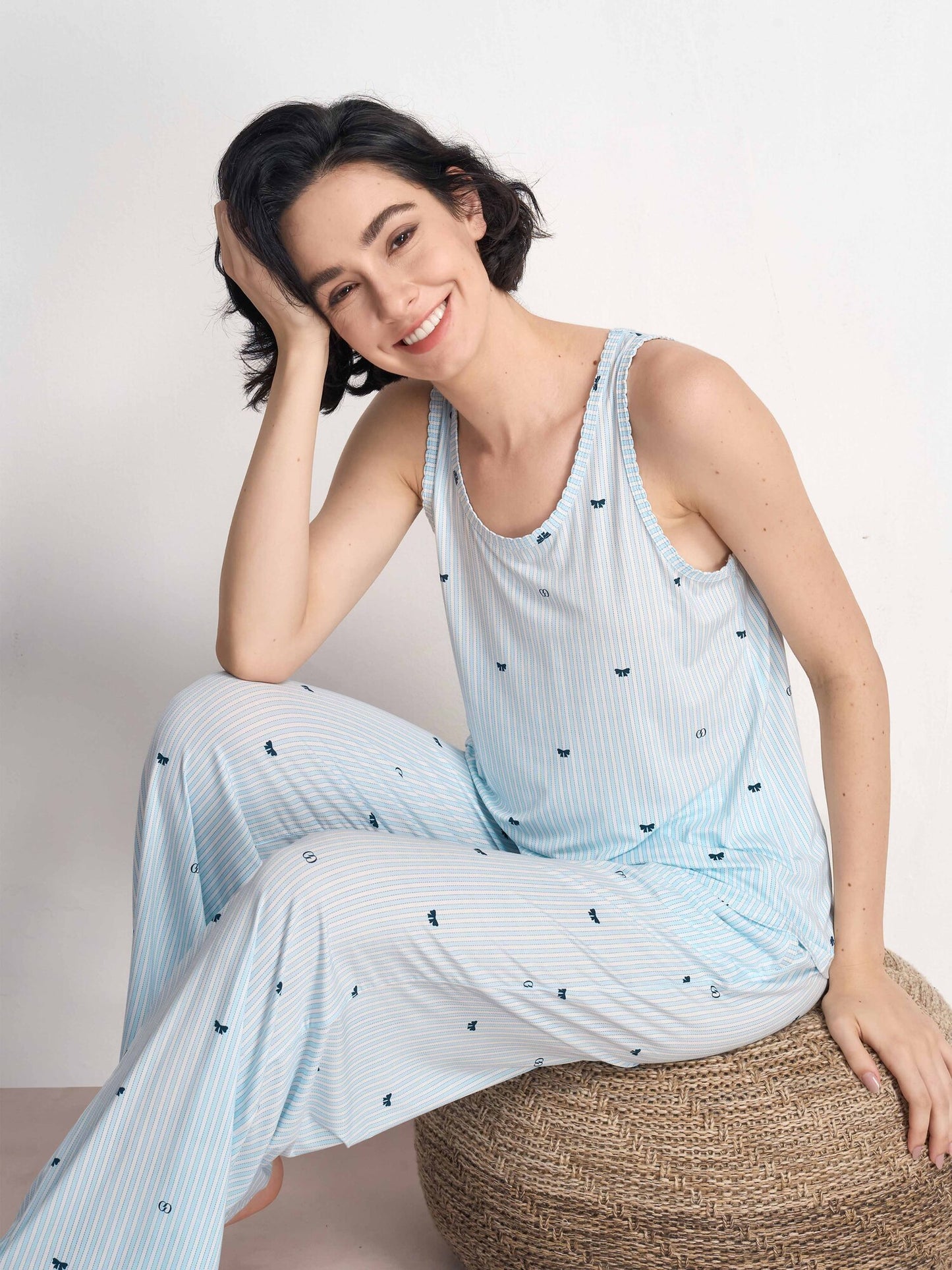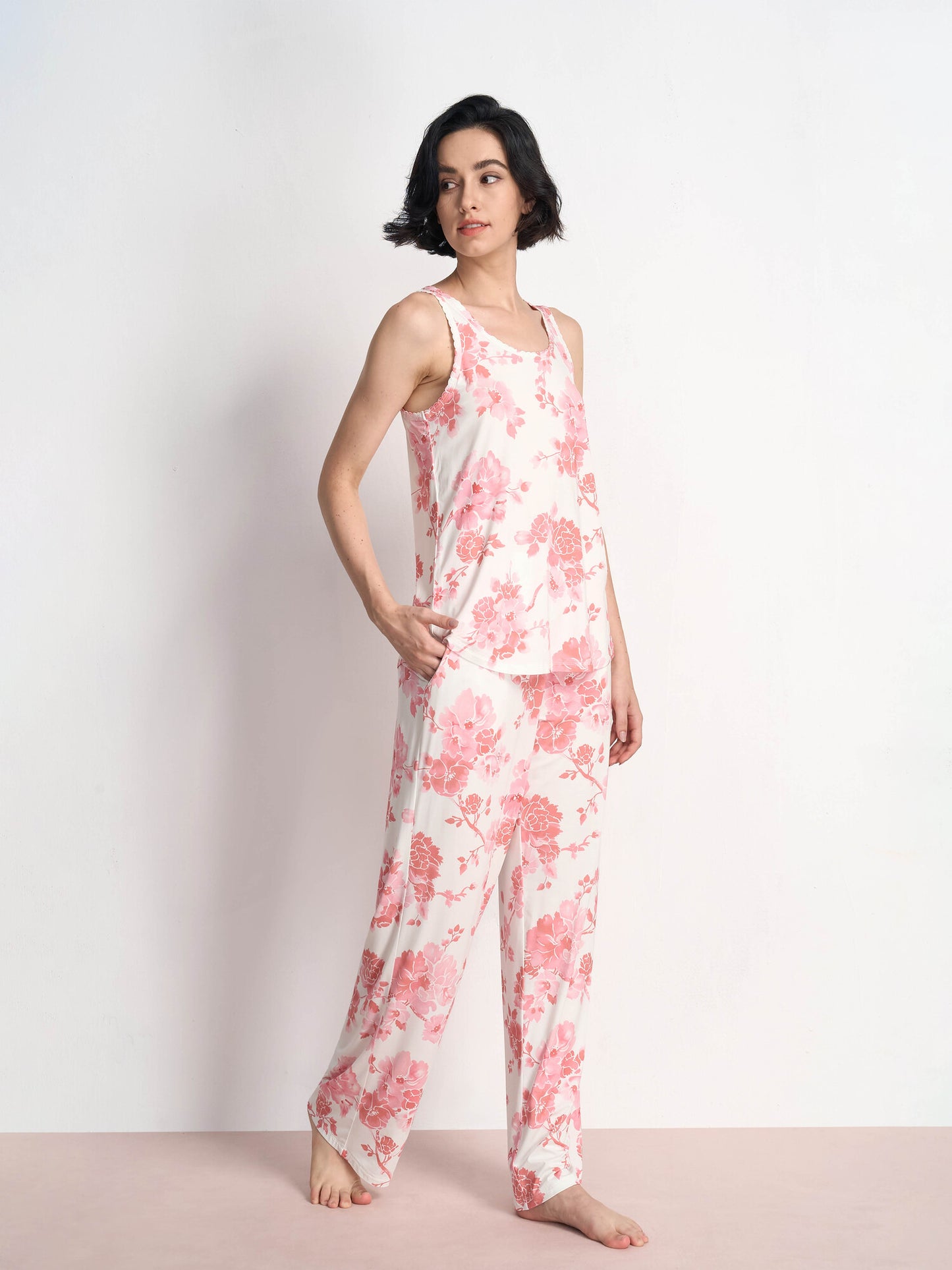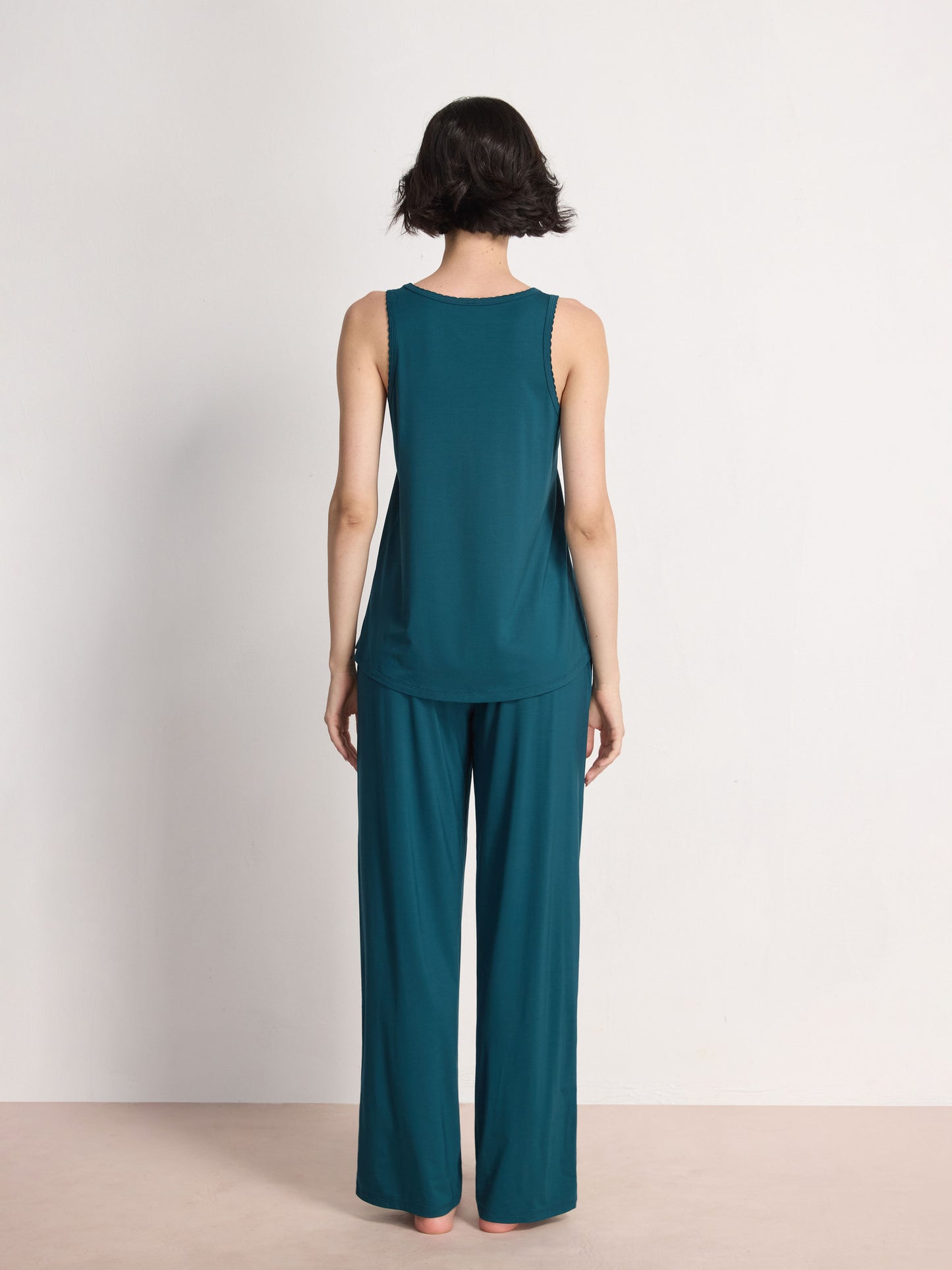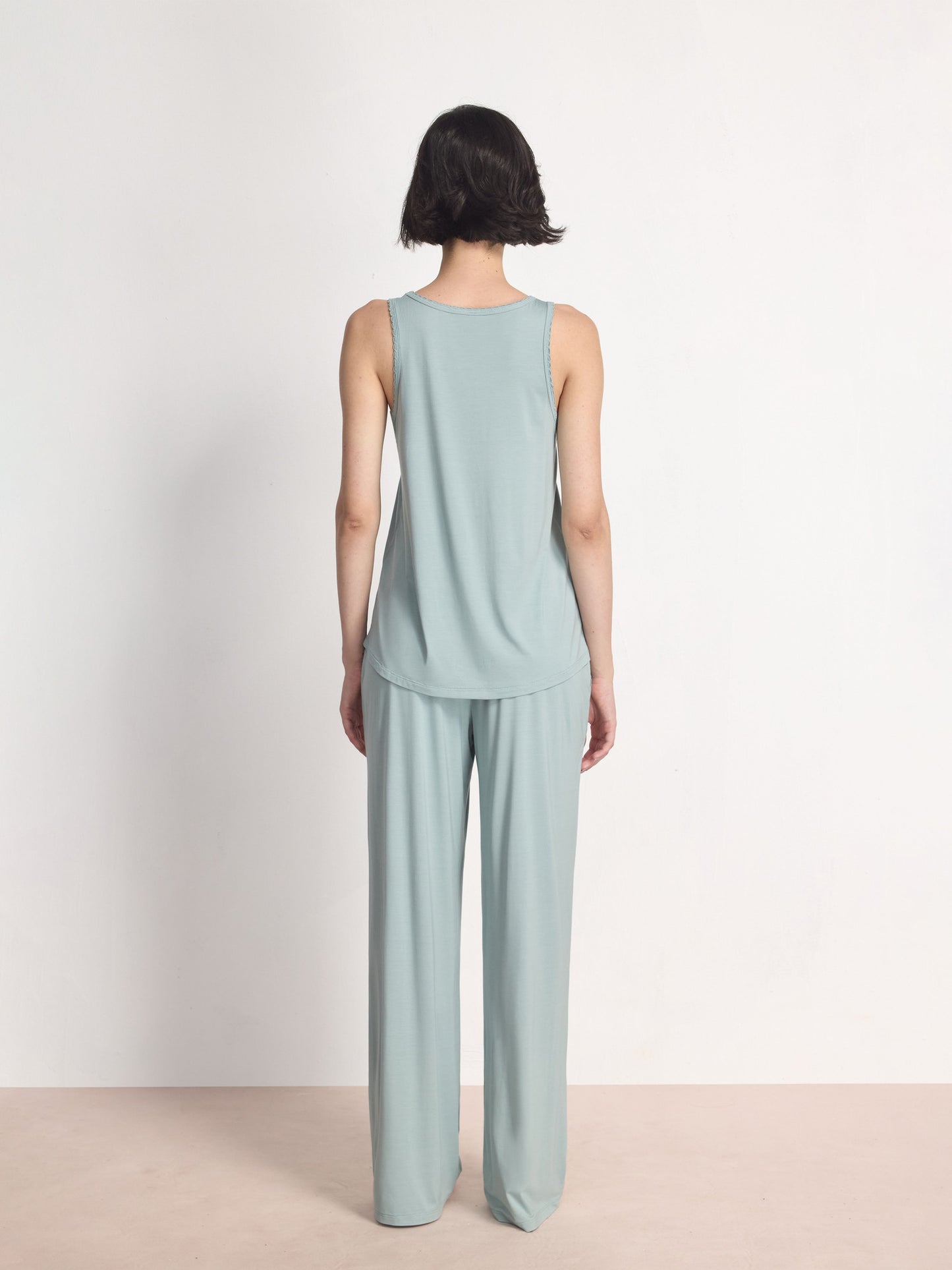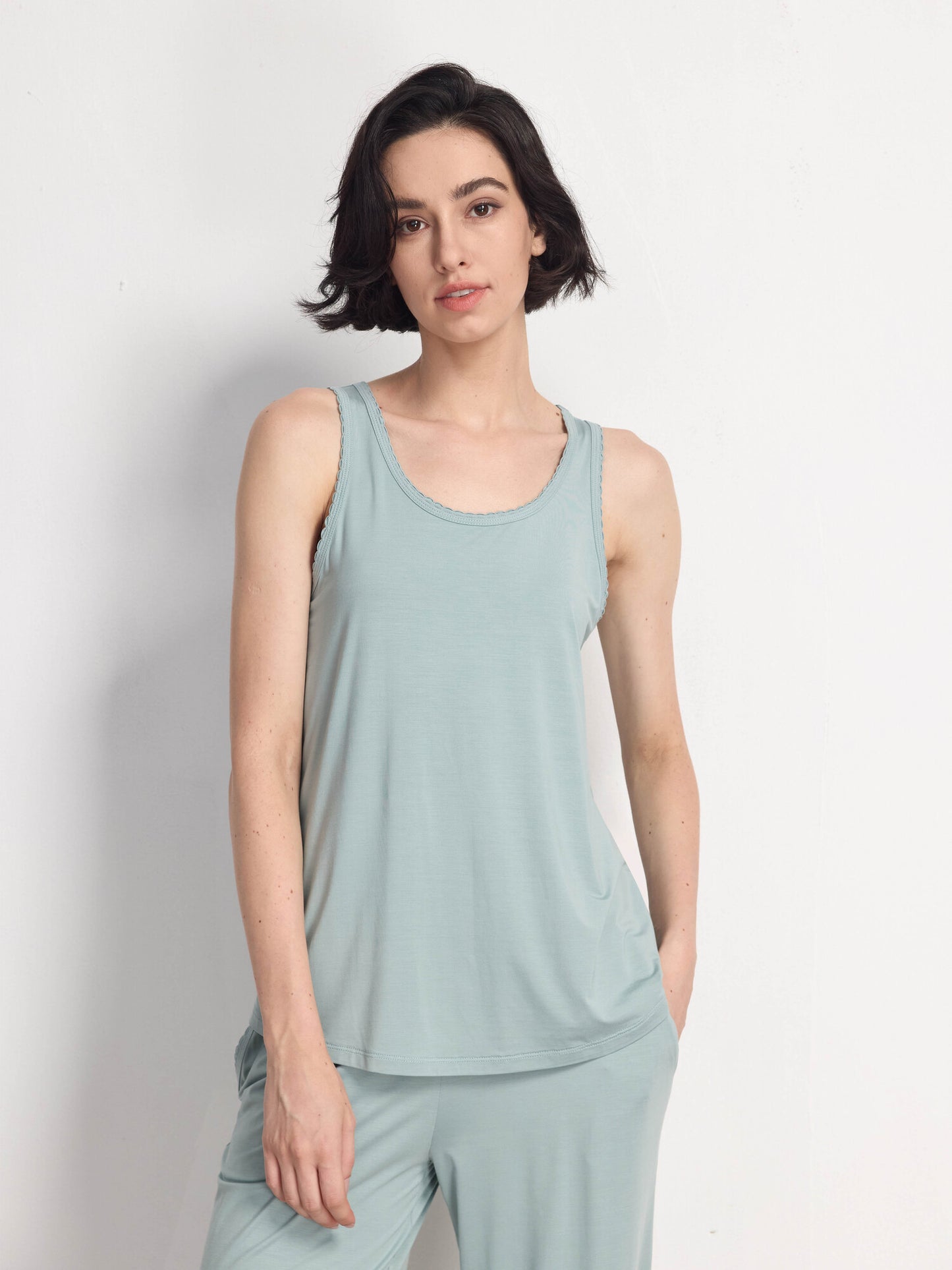A cooling bamboo tank pajama set designed for zero-restriction comfort—soft on skin, moisture-friendly, and effortless to wear. The sleeveless tank and wide-leg pants drape smoothly without cling, while refined trim details add quiet sophistication to a minimalist look.