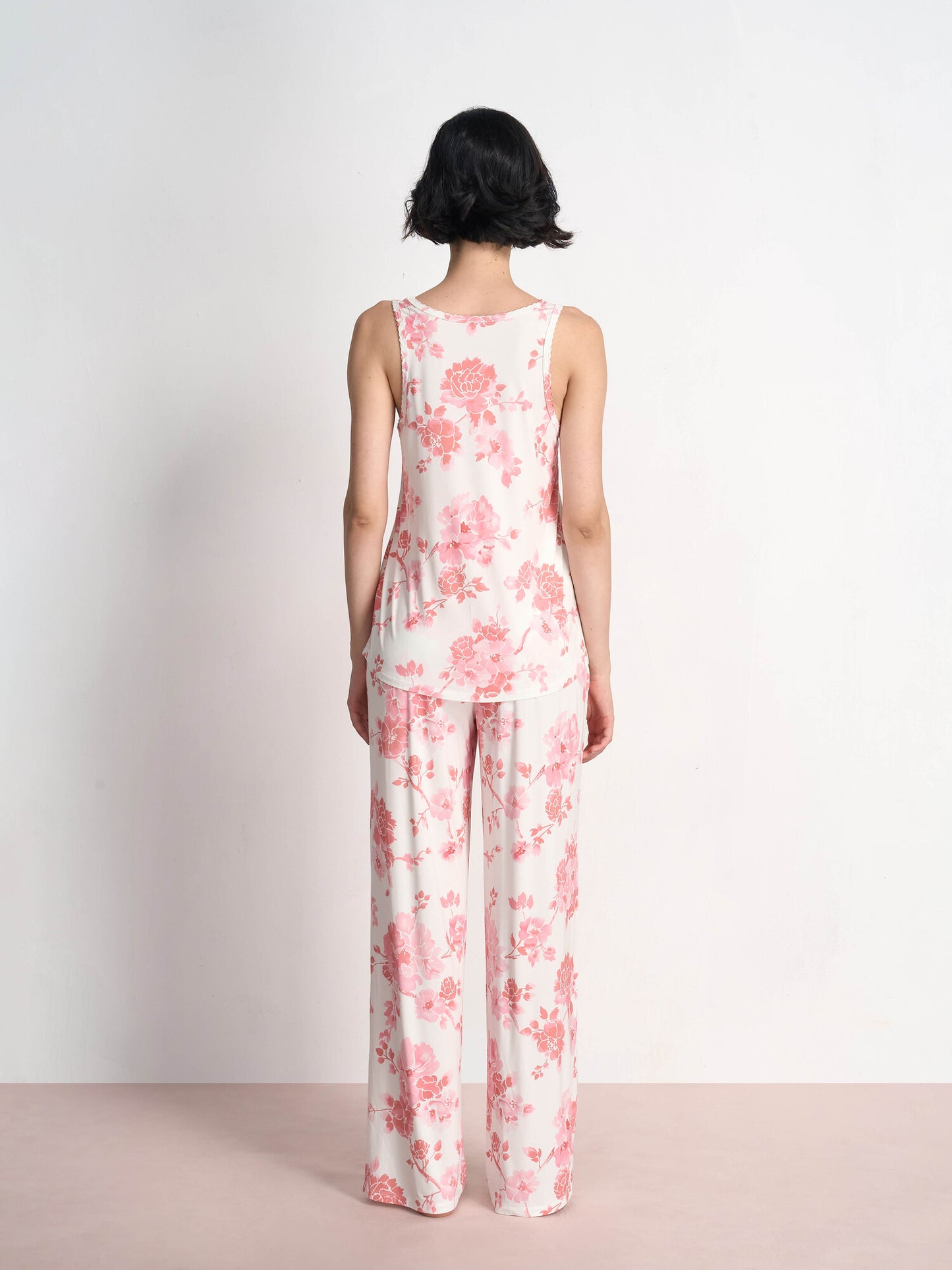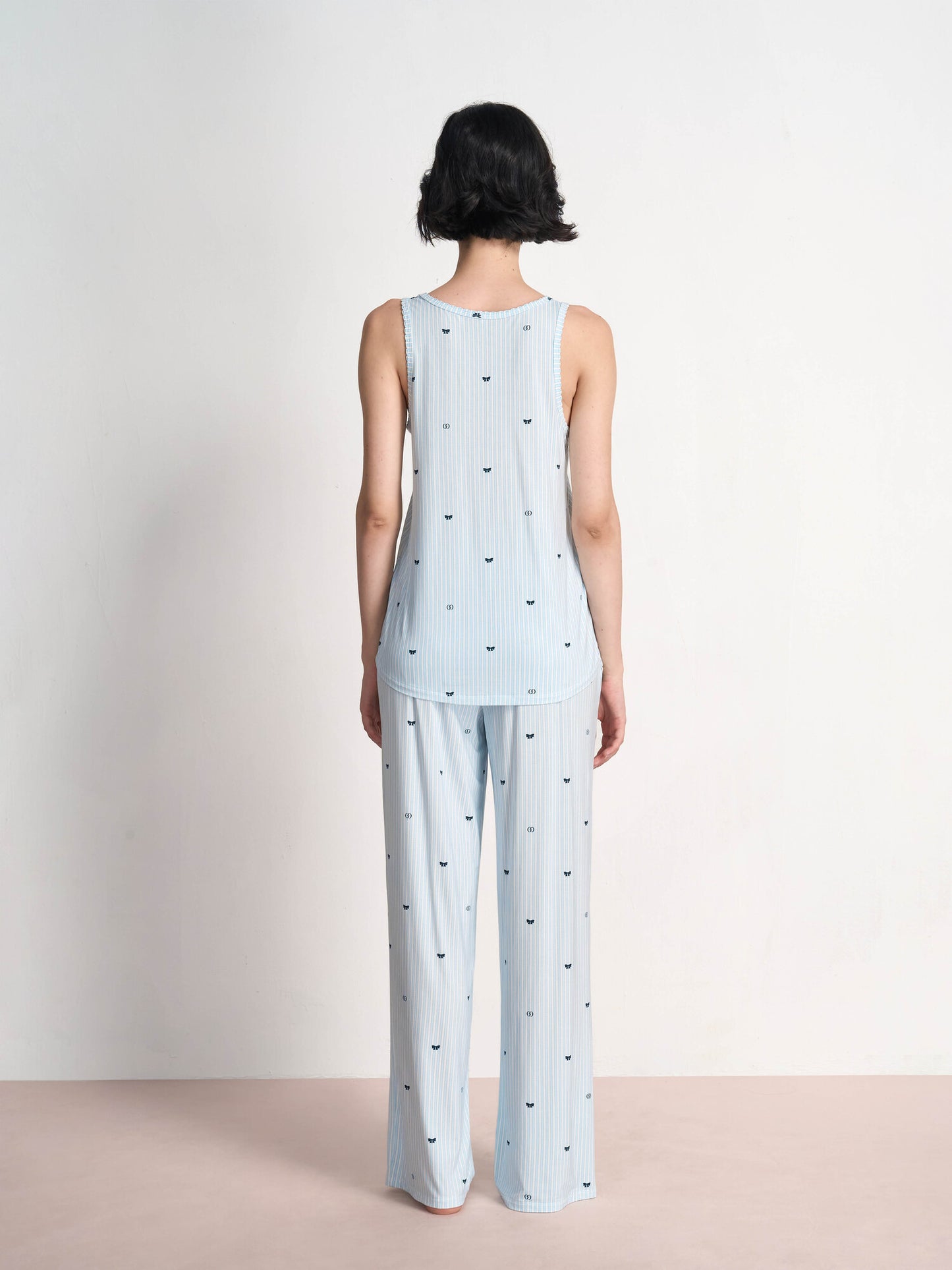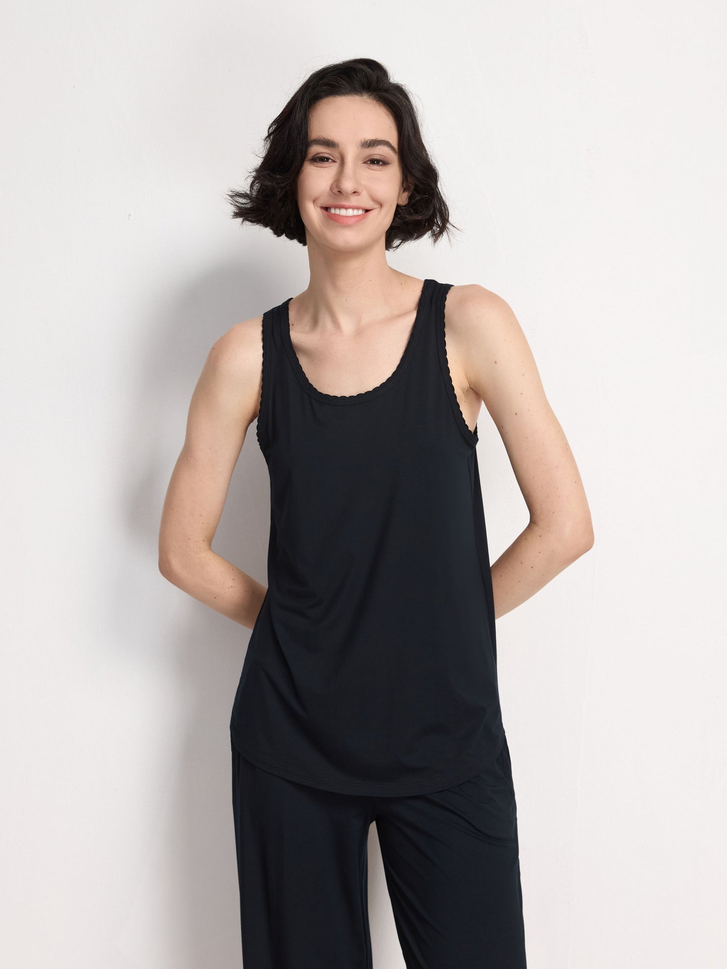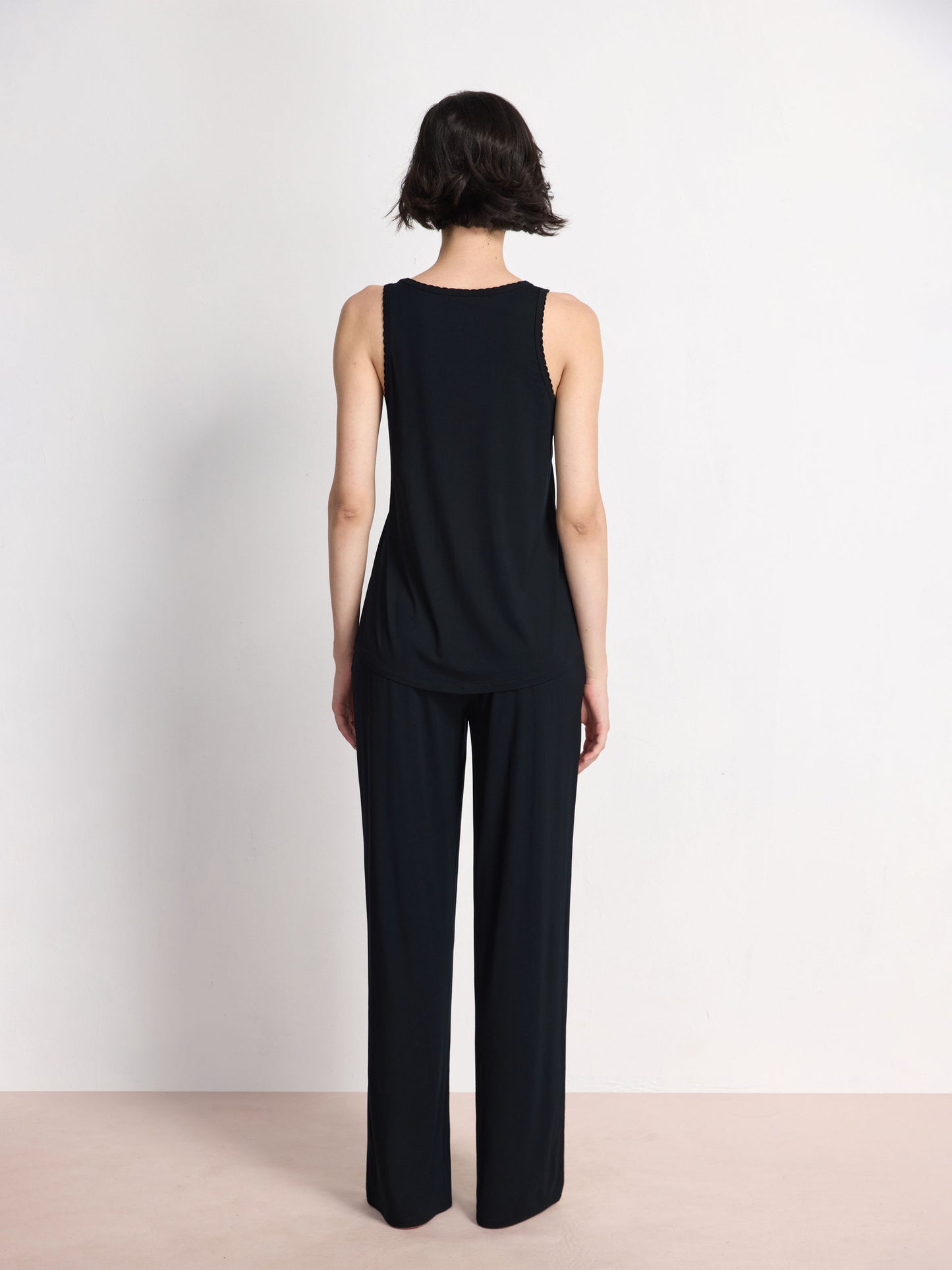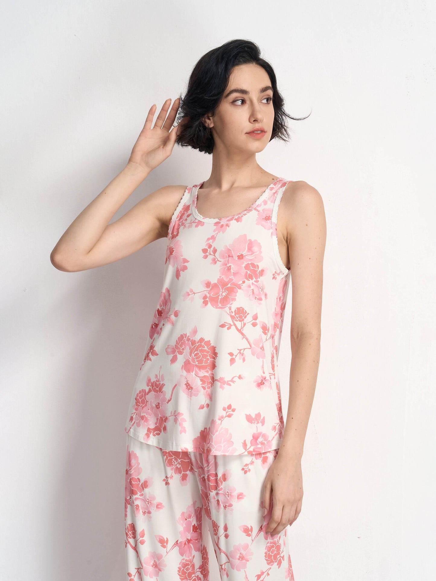 A cooling bamboo tank pajama set designed for zero-restriction comfort—soft on skin, moisture-friendly, and effortless to wear. The sleeveless tank and wide-leg pants drape smoothly without cling, while refined trim details add quiet sophistication to a minimalist look.